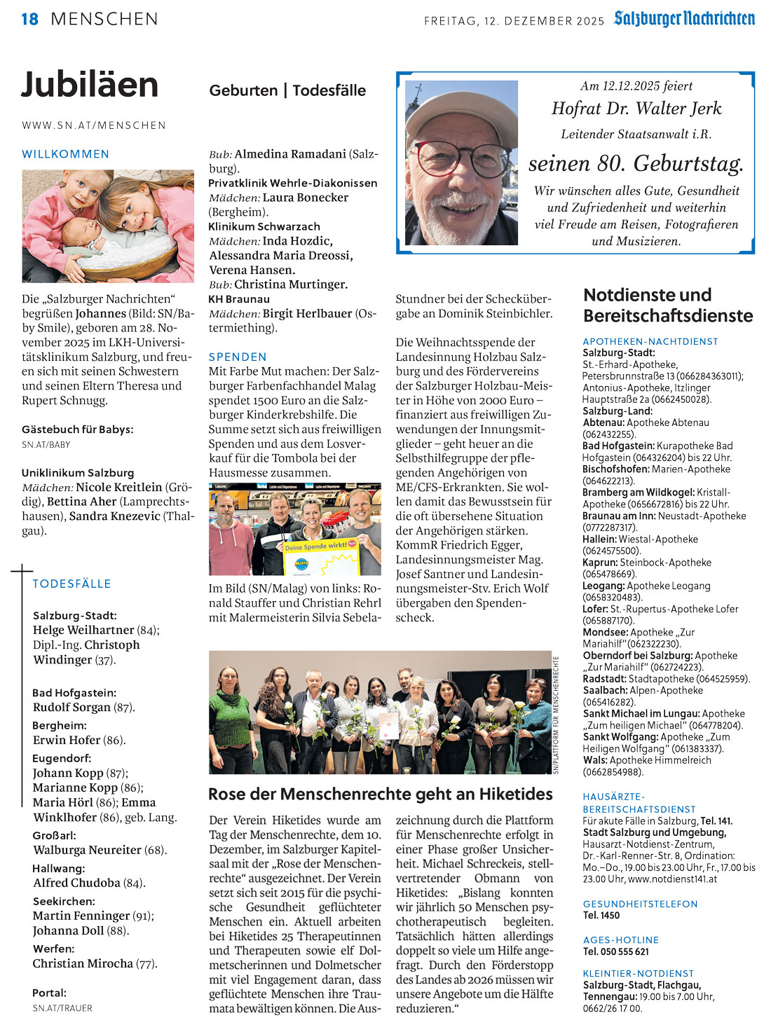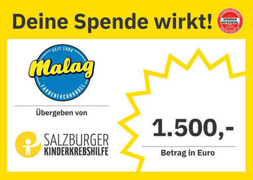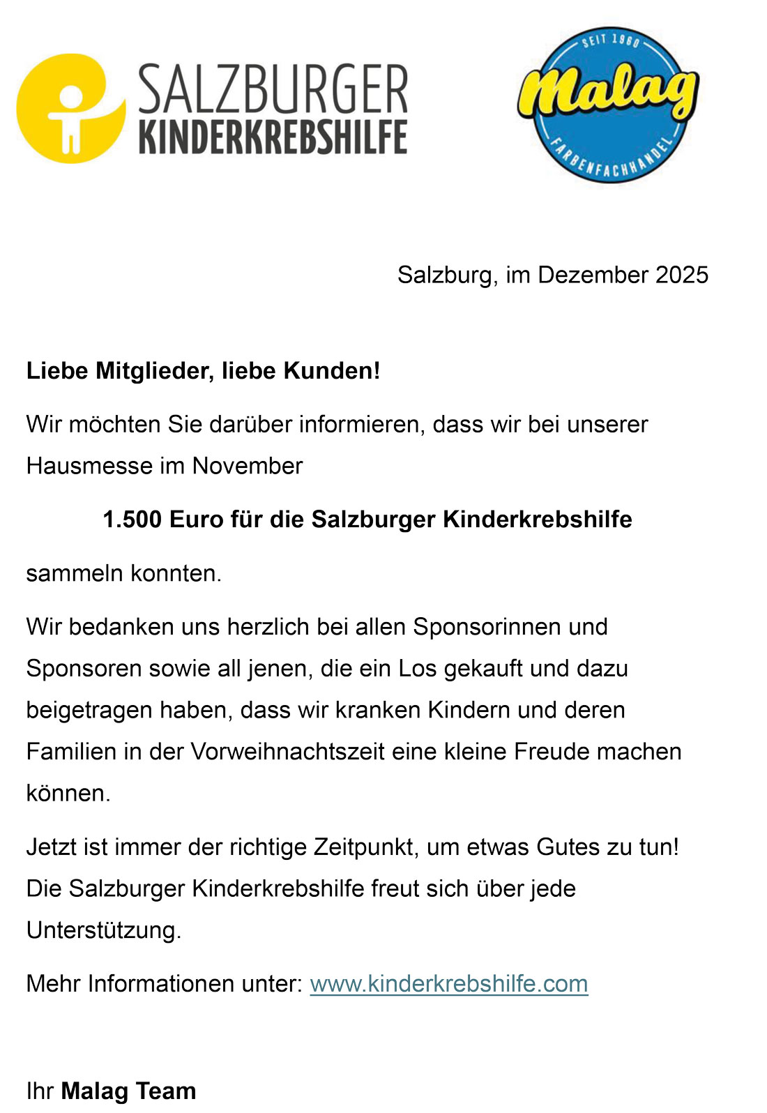 Wir möchten Sie darüber informieren, dass wir bei unserer Hausmesse im November 1.500 Euro für die Salzburger Kinderkrebshilfe sammeln konnten.